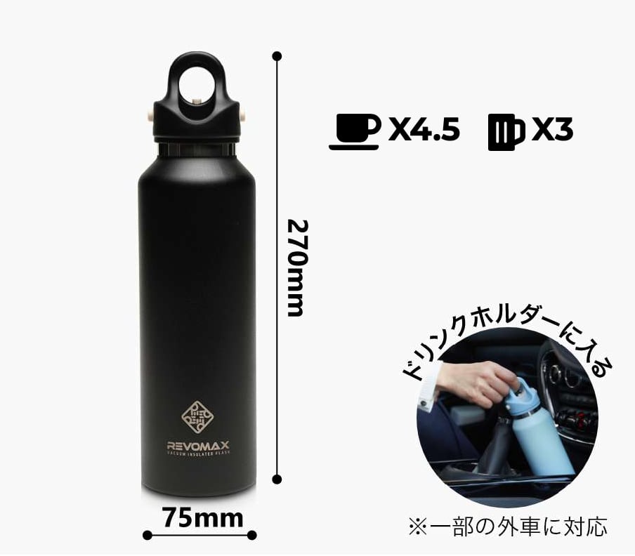 従来のネジ込み式のキャップは、開け閉めが面倒であるばかりか、きちんと閉まっていなければ漏れてしまいます。どうすればこの問題を解決できるのか、と真剣に考えた結果生まれたのがワンタッチ開閉式の独自キャップを搭載したRevoMaxです。RevoMaxは簡単・確実にキャップを開け閉めすることができます。また、長時間の保温保冷性能も業界トップクラスです。